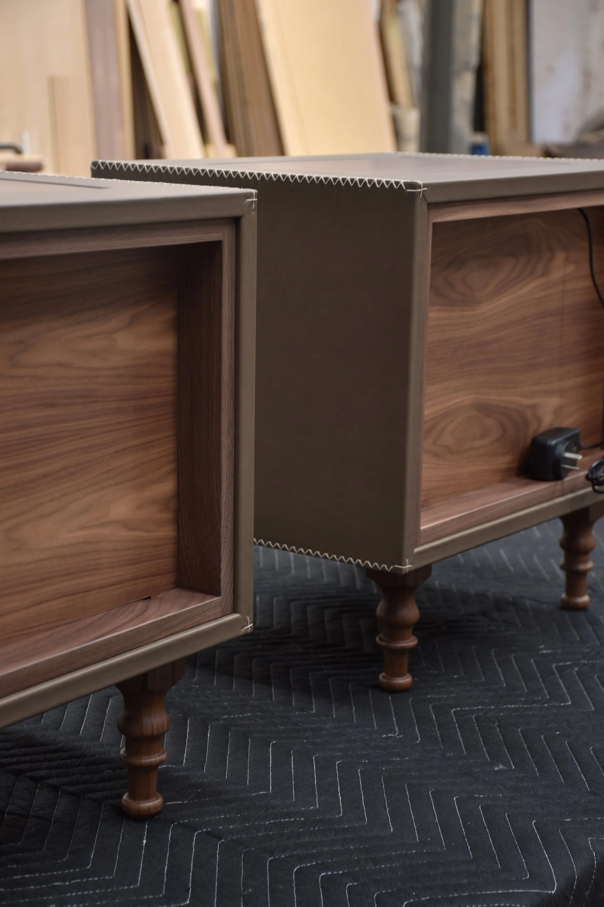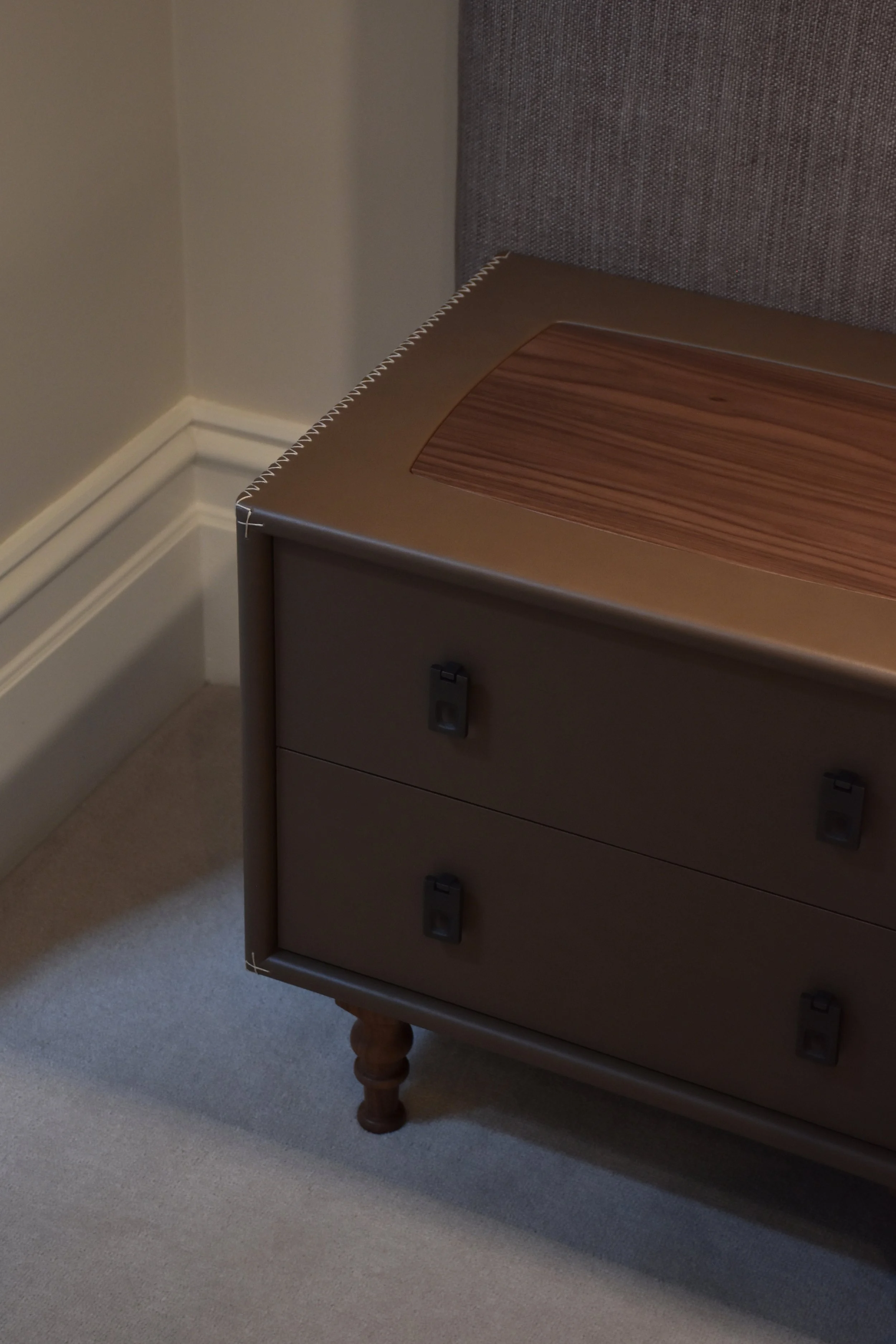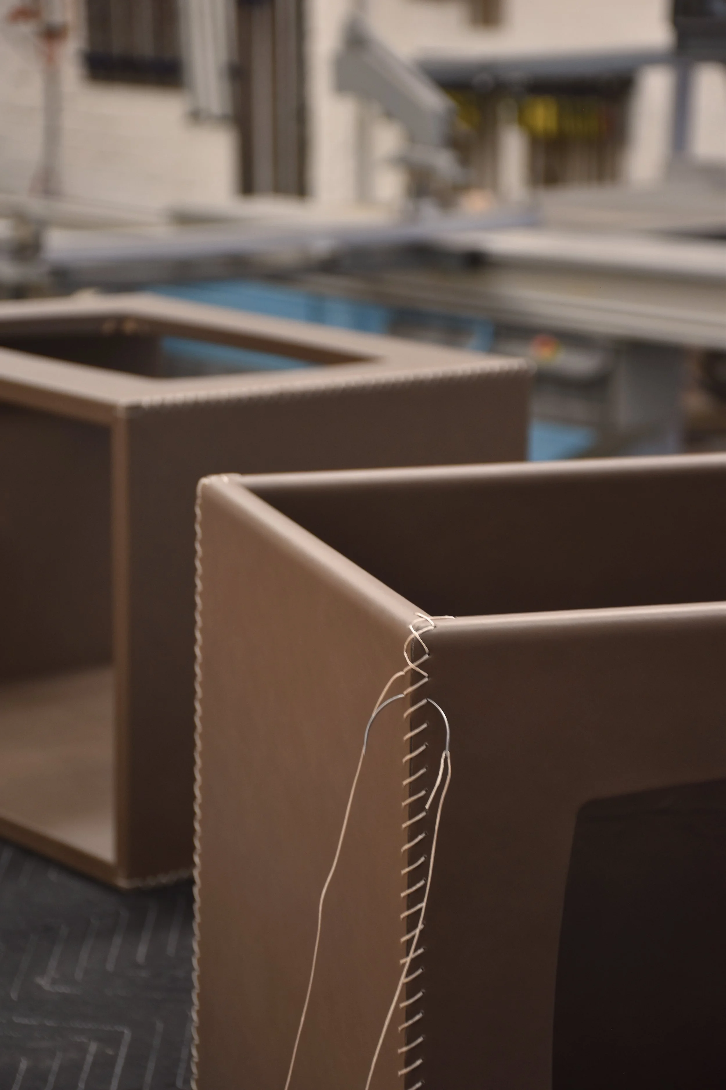 Leather wrapped in Pelle Leathers Toledo Village (optional) and hand stitched with a heavy gauge cotton thread, Beige No. 104, complimented with solid Walnut timber and aged brass drawer pulls.