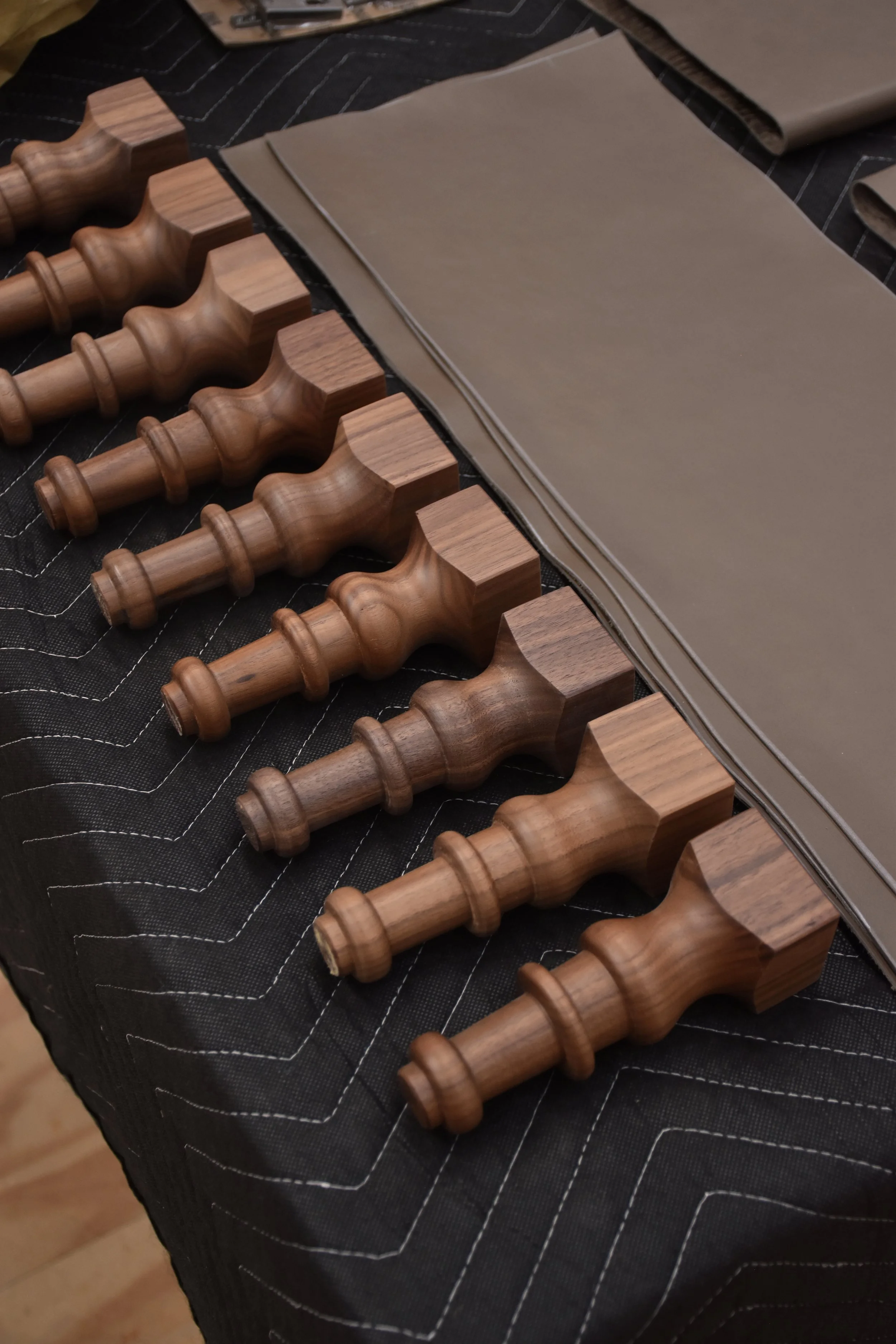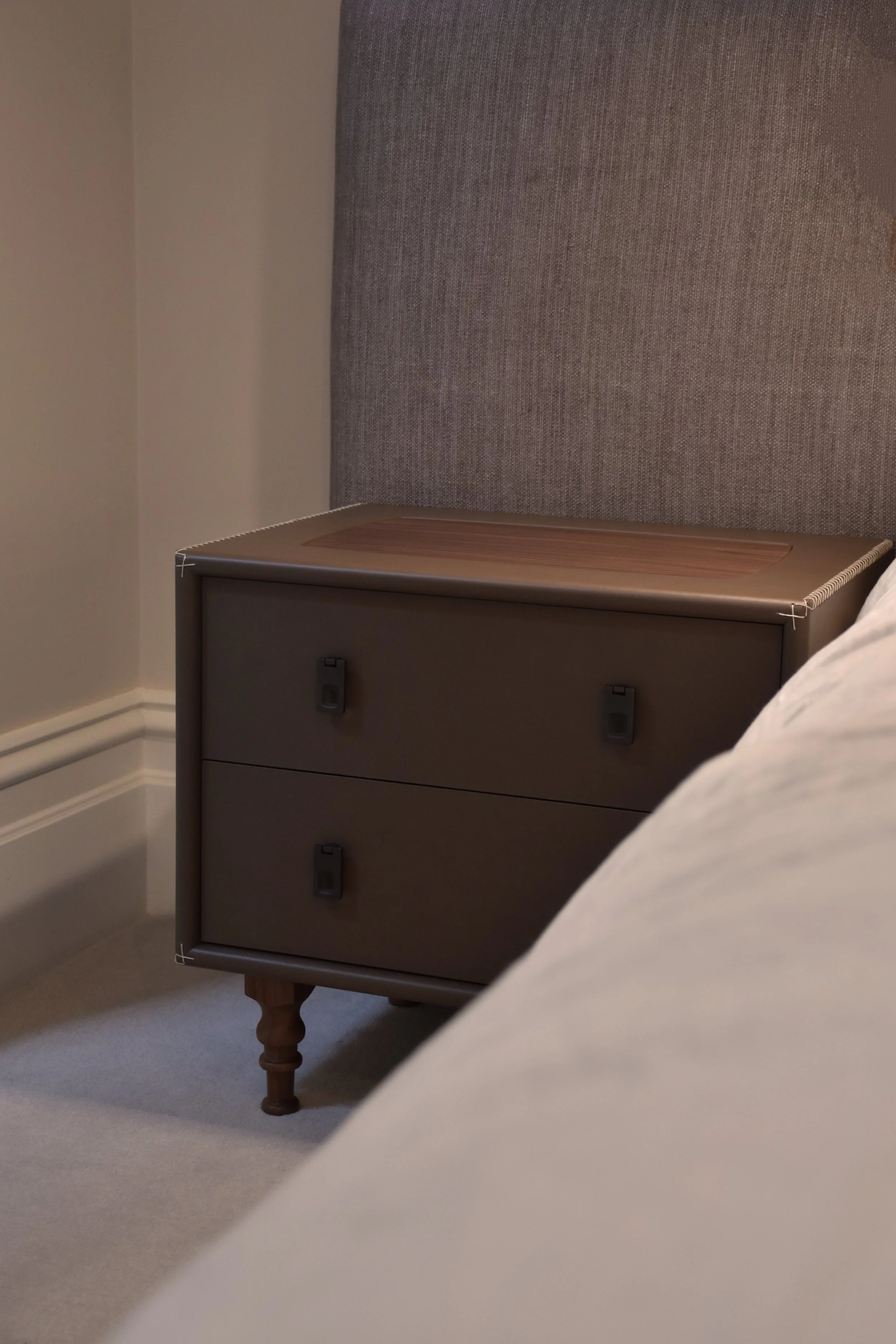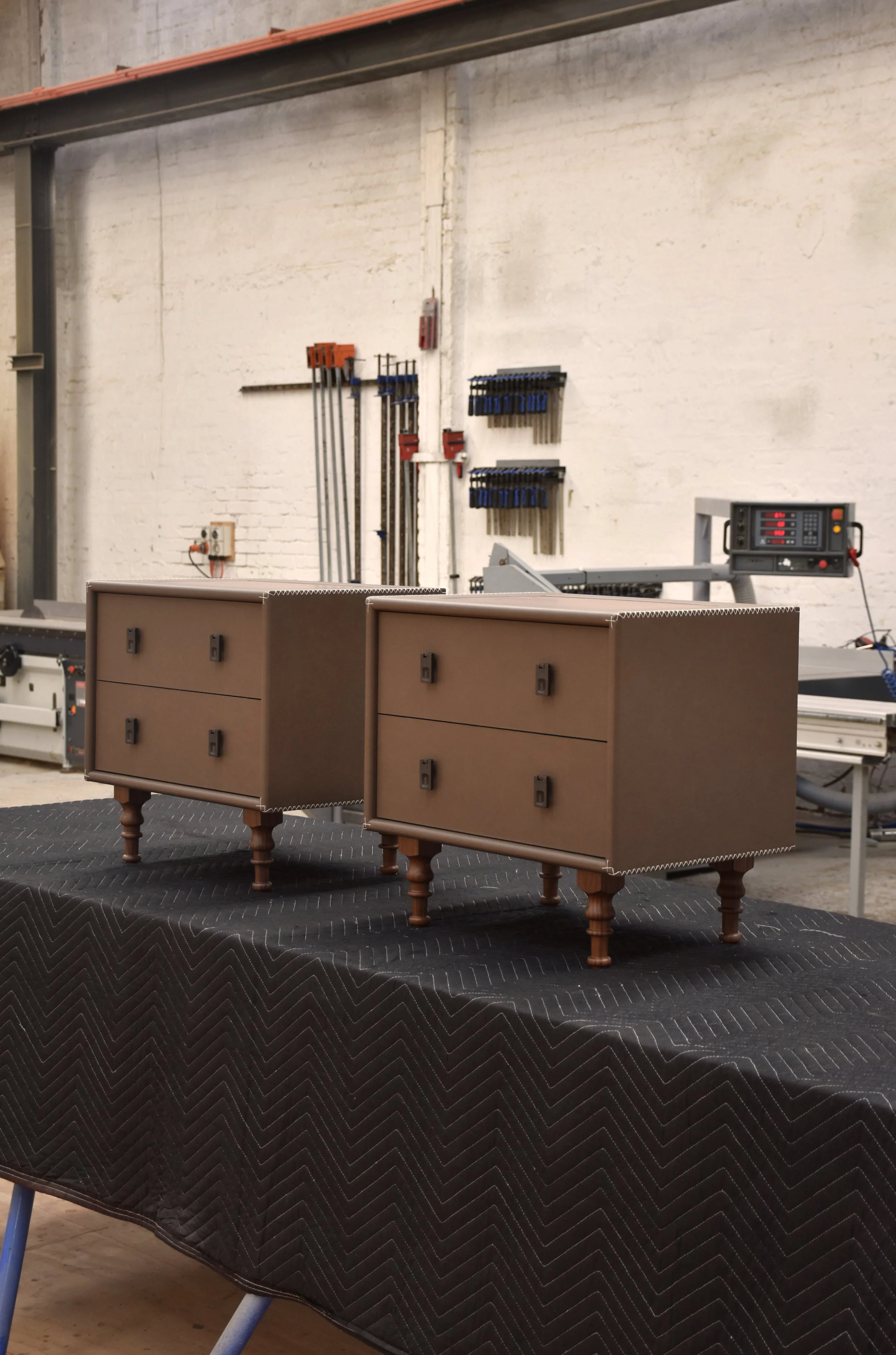 Leather wrapped in Pelle Leathers Toledo Village (optional) and hand stitched with a heavy gauge cotton thread, Beige No. 104, complimented with solid Walnut timber and aged brass drawer pulls.